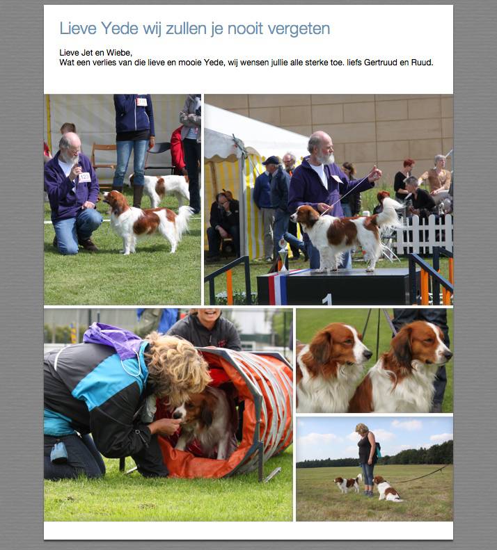 Na veel dierenartsen hebben bezocht Osteophaat Jannemarie Frowijn ,zelfs een Anatron behandeling stabilisatie zenuwen 4 injectie,s in zij rug mocht ,ook dat mocht geen baat hebben , zodat hij zijn rugletsel niet te boven kon komen , helaas in moeten laten slapen op 21 januari 2014 op nog zeer jonge leeftijd 5,5 jaar . Hij Yede had voor vele lieve nakomelingen gezorgd hij was dekreu , net als zijn vader Thieme .Ook kennels mee opgestart ,in zijn nakomelingen leeft hij in voort ,En voor altijd in ons hart ,we missen hem nog altijd ontzettend . Het was de mooie zoon onze Thieme &Tjarda Dino v.d LutteVaert ,ons toppertje Yede shows en altijd super gehoorzaam . Zelfs was hij een keer boos op de baas ,was bij de ''put'' een Drentse patrijs hond ging bij ''zijn'' baas aan de voet zitten , Yede dacht wat wil hij van mijn baas ,Maar Wiebe hem een tik gaf beet hij van zich af ,niet erg hoor ''maar een LutteVaert laat niet met zich sollen '' Hij Yede won in 2013 . De Nederlandse hondenrassen Zwolle van de 77 ingeschreven kooikerhonden en werd daarbij ook nog tweede alle Nederlandse rassen ''Lieve Rust zacht lieve Yede ''. Je had zo,n super karakter, We hadden toch zoveel prachtige plannen met Yede in petto ,maar mocht niet zo zijn ,denken nog vaak aan jou terug ,soms ook nog wel humoristisch wat jij altijd deed .Ondanks we nog twee kooikerhondjes hebben . We nooit zullen vergeten ,Het is onzettend jammer we je ''door zo,n verschrikkelijk ongeluk die akelige Duitse Herder je moesten missen '' Alles en dan ook alles met liefde er aan gedaan hem er boven op te krijgen , Met pijn in ons hart moeten wij hem laten gaan. Liefste Yede je hebt altijd een plekje in mijn hart Ligt op mooiste plekje van de wereld begraven . Bij de Leiepoel boerderij ik vroeger heb gewoond Bij onze vorige gestorven honden , Doeke wettterhoun ,Keimpe kruising en half ,broertje Marne die daar ook begraven liggen